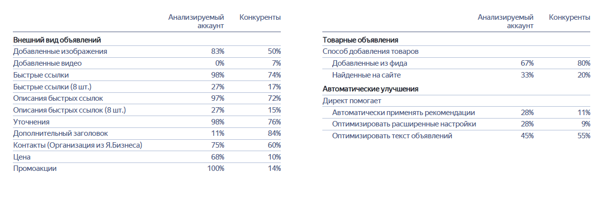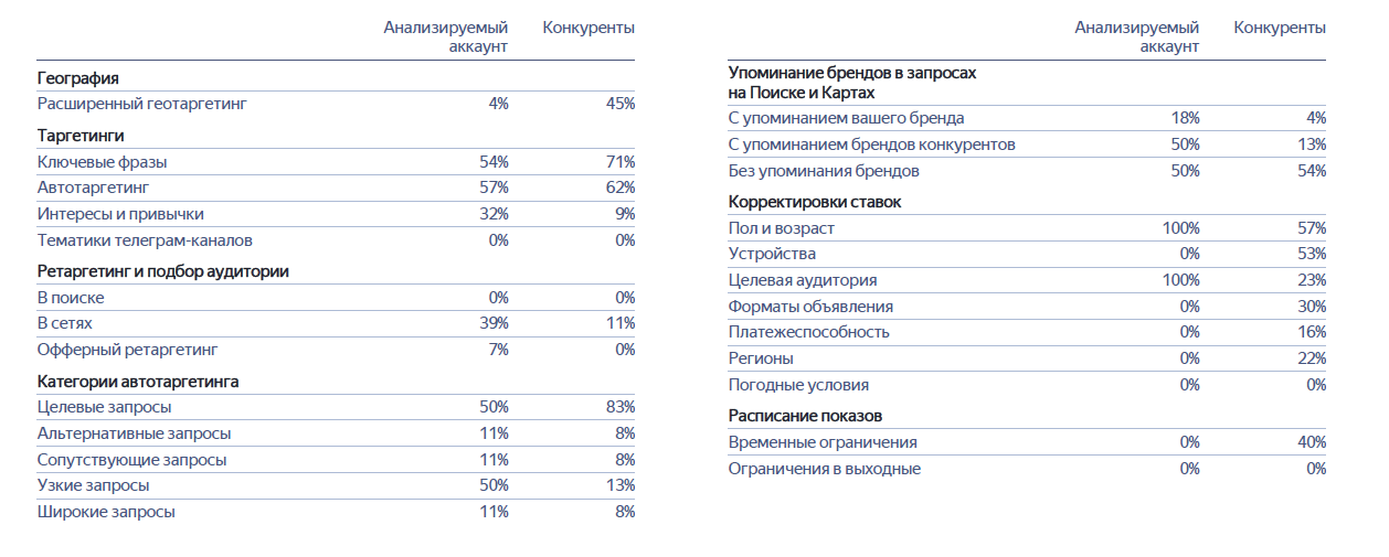 - Ключевые фразы: у вас 54% кампаний используют (у конкурентов 71%) — вы упускаете часть трафика.