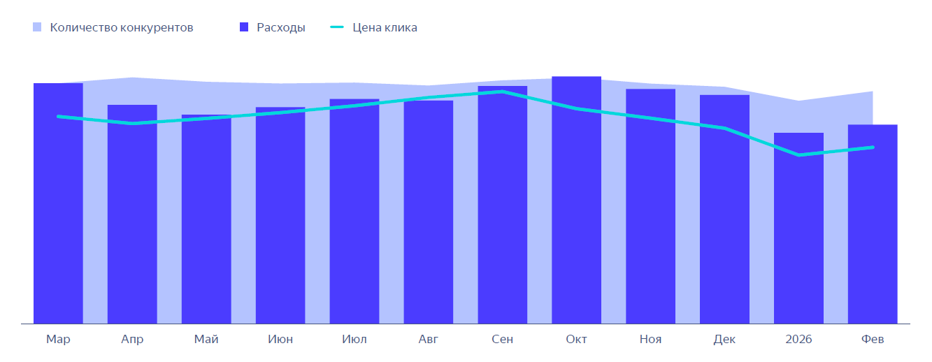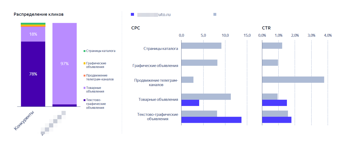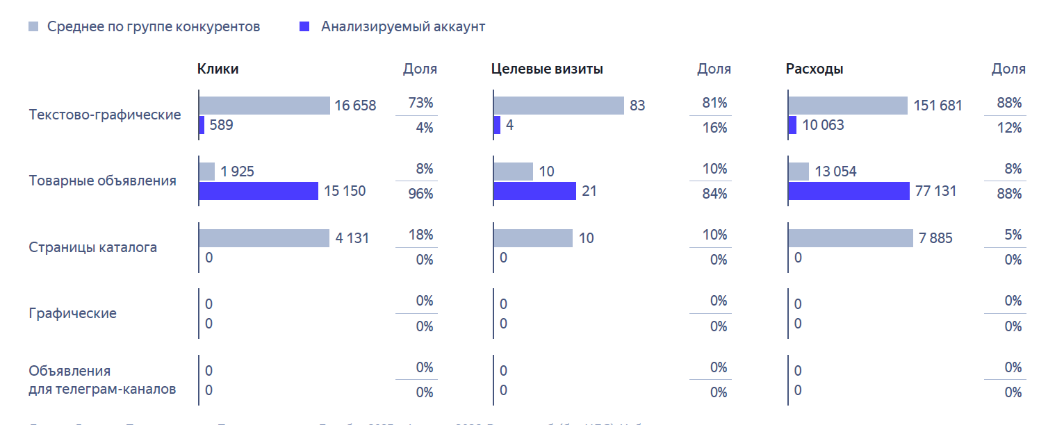 Отдельный блок — конкурентный анализ. Он показывает, какую долю рынка (показов, кликов, расходов) вы занимаете по сравнению с лидерами категории.