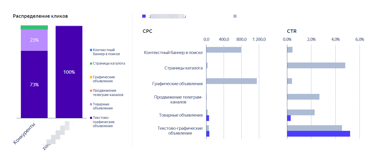 - Стоимость клика сильно ниже конкурентов, что может говорить о не очень привлекательных местах размещения, либо хорошо проработанной рекламной кампании
