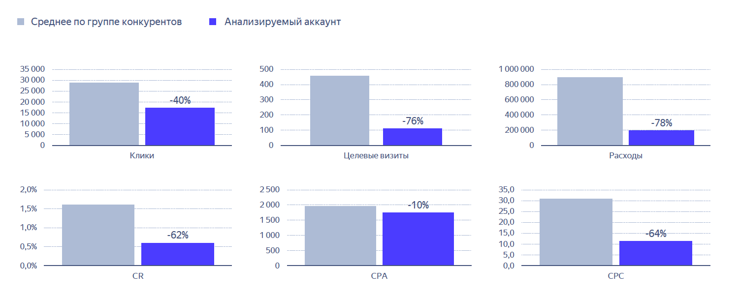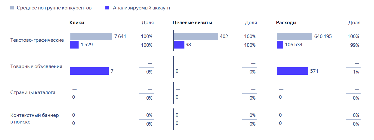Конкурентный анализ: доли показов, расходов, кликов и сравнение с лидером