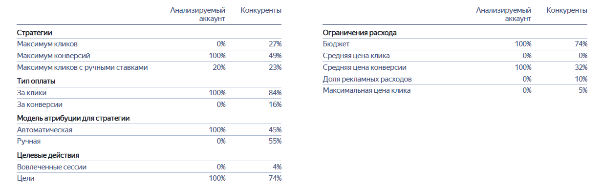 У вас: стратегия «Максимум конверсий» (100%) с оплатой за клики (100%). У конкурентов: 49% используют «Максимум конверсий», 23% — «Максимум кликов с ручными ставками». При этом конкуренты чаще ограничивают бюджет по средней цене конверсии (32%), а вы — нет (0%). Это означает, что вы можете переплачивать за нецелевые конверсии.